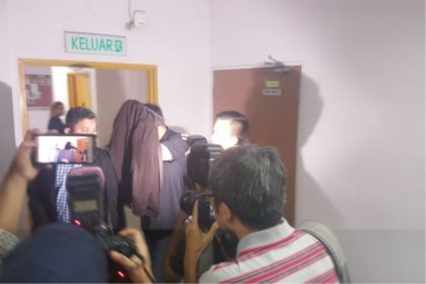 Rizam Sahar menutup mukanya dengan jaket ketika polis mengiringinya ke bilik perbicaraan di Mahkamah Sesyen di Johor Baru pada 15 Disember 2016.