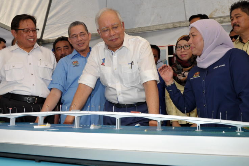 Najib mendengar penerangan daripada Nancy Shukri (kanan) mengenai Jambatan Batang Sadong pada majlis perasmiannya pada Ahad. fotoBERNAMA