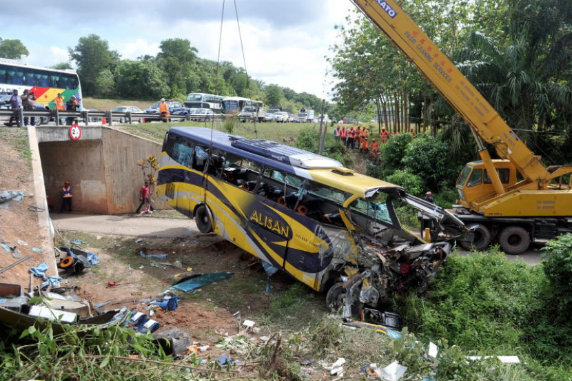 Dalam kejadian awal pagi semalam itu, bas berkenaan terjunam ke dalam cerun dan merempuh benteng konkrit di Kampung Jayor di KM 137.3 berdekatan kawasan Rehat dan Rawat Pagoh, menyebabkan 14 orang maut dan 16 cedera.