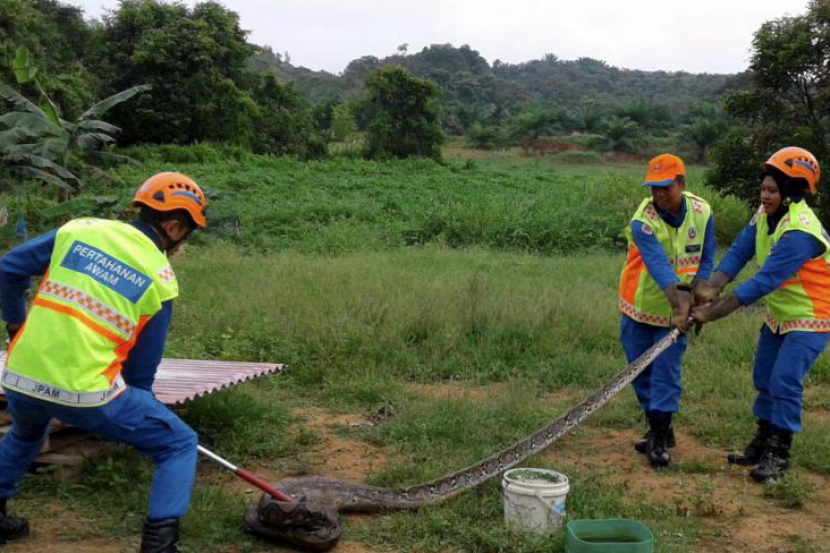 Anggota APM berusaha menangkap seekor ular sawa seberat 10 kilogram di Pontian. Foto: Bernama