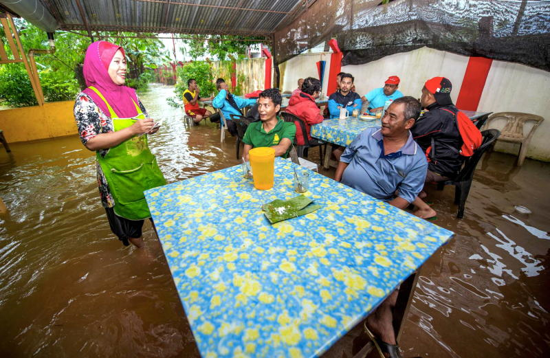 PASIR MAS: Seorang peniaga gerai makan di Gual Tinggi, Rantau Panjang di sini, tetap meneruskan perniagaannya meskipun gerainya dimasuki air sedalam kira-kira 0.2 meter.