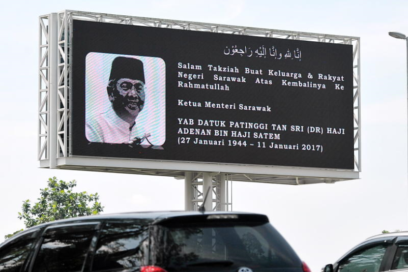 Antara ucapan tertulis 'Salam takziah buat keluarga dan rakyat negeri Sarawak atas kembalinya ke rahmahtullah Ketua Menteri Sarawak' serta 'Takziah di atas pemergian Datuk Patinggi (Dr) Tan Sri Adenan Satem. Al Fatihah' yang dibuat dalam paparan hitam putih.