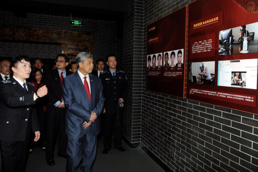 Dr Ahmad Zahid Hamidi (tengah) melihat gambar rajah yang dipamerkan sambil mendengar penerangan Ketua Akademi Anti-Dadah Kolej Polis Yunnan, Luo Hanqing (kiri) semasa melawat Narco Educational Base sempena lawatan kerja beliau ke China pada Sabtu. Foto: Bernama