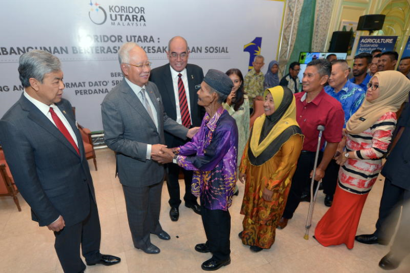 Najib Tun Razak bersalaman dengan Mahmod Mat Saman serta para penerima manfaat dalam program-program berpaksikan rakyat oleh NCIA sambil disaksikan Dr Ahmad Zahid Hamidi dan Ketua Eksekutif NCIA, Datuk Redza Rafiq (tiga, kiri) selepas mempengerusikan mesyuarat Pihak Berkuasa Pelaksanaan Koridor Utara (NCIA) di Bangunan Perdana Putra pada Rabu. Foto: Bernama