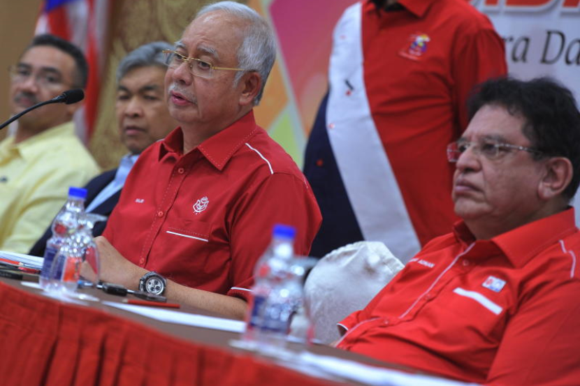 Najib Tun Razak (dua, kanan) pada sidang media selepas Mesyuarat Majlis Tertinggi Umno di Menara Datuk Onn pada Jumaat. Foto: Bernama