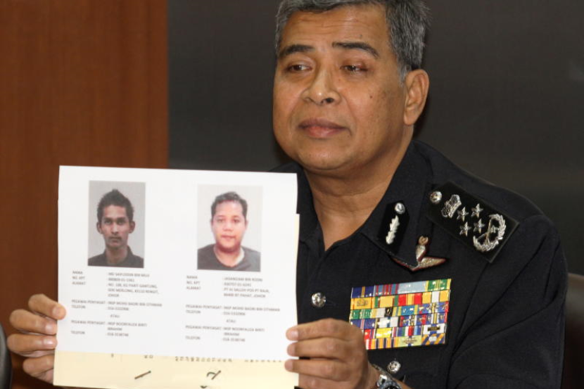 Ketua Polis Negara, Tan Sri Khalid Abu Bakar menunjukkan gambar Jasanizam Rosni dan Mohd Sanusi Satar pada sidang media tahun lalu. Foto: SAMUEL ONG/The Star