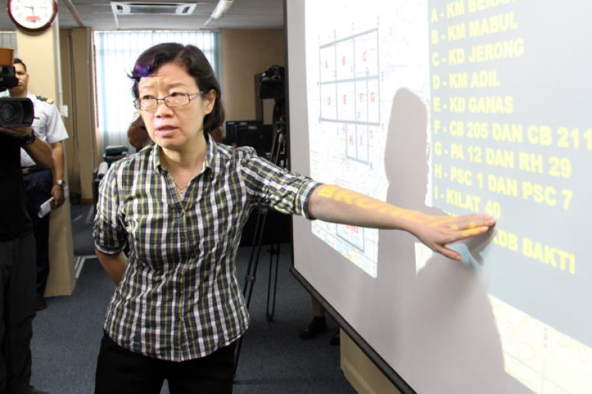 Konsul Besar China di Kota Kinabalu, Chen Peiji menunjukkan slaid taklimat operasi oleh Pengarah Maritim Daerah Laksamana Pertama Maritim, Adam Aziz pada hari keempat tragedi bot karam di Bilik Operasi Maritim, Selasa.