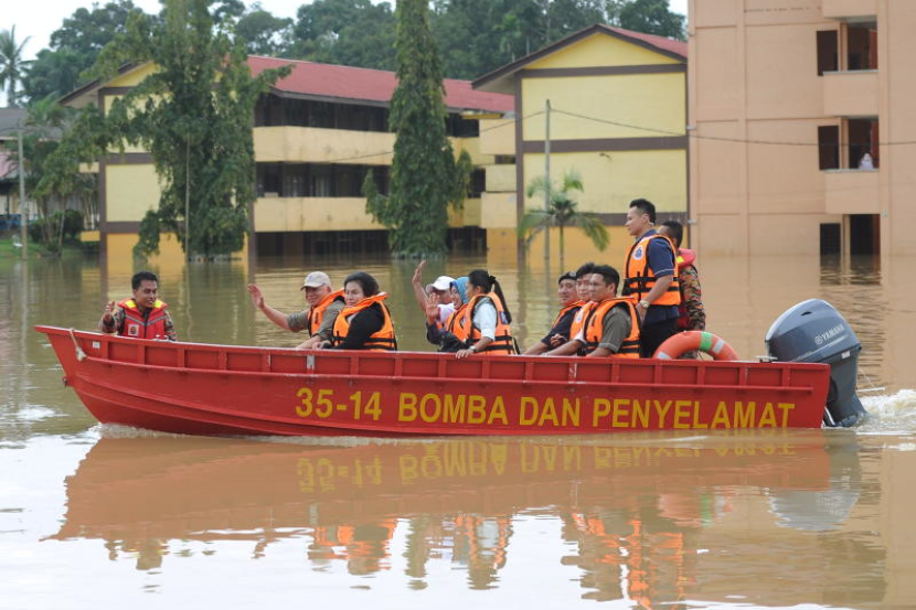Perdana Menteri Datuk Seri Najib Tun Razak bersama isteri Datin Seri Rosmah Mansor menaiki bot melihat keadaan Sekolah Menengah Paloh Hinai yang ditenggelami air ketika meninjau kawasan Pekan yang dilanda banjir, Rabu.
