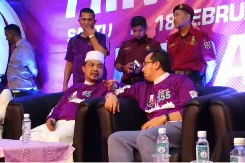 Jamil Khir dilihat di pentas utama di Padang Merbok pada pukul 7.45 petang ketika hujan renyai, bersama timbalannya Datuk Dr Asyraf Wajdi.