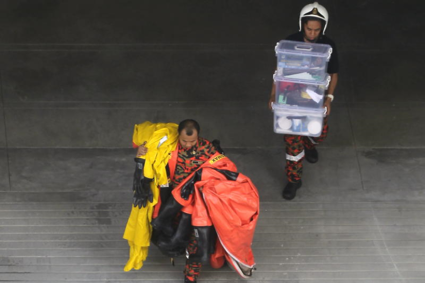 Pada kira-kira pukul 1.10 tengah hari semalam, kira-kira 10 anggota bomba dilihat keluar daripada bangunan itu dengan membawa pakaian hazmat dan tangki oksigen.