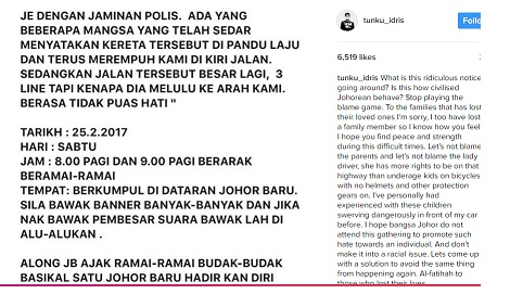 JOHOR BARU: Tunku Temenggong Johor Tunku Idris Sultan Ibrahim menyelar sebilangan individu yang menggalakkan orang lain untuk berkumpul dan membantah terhadap pemandu yang terlibat dalam kemalangan yang mengorbankan lapan remaja berbasikal pada 18 Februari lalu.