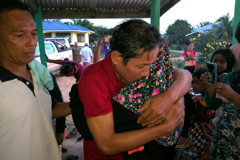 Jefri (tengah) memeluk anak bongsunya Syakilahsebaik tiba di kampung halamannya di Kampung Tambisan, Isnin. fotoBERNAMA