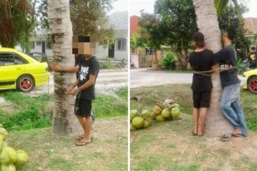 SITIAWAN: Gara-gara mencuri kelapa, dua lelaki menerima padah apabila orang kampung bertindak menangkap dan mengikat mereka pada sebatang pokok kelapa sebelum diserahkan kepada anggota polis di kawasan Sekolah Agama Rakyat Al-Hidayah, Kampung Tersusun Batu 7 Lekir, di sini, Jumaat.