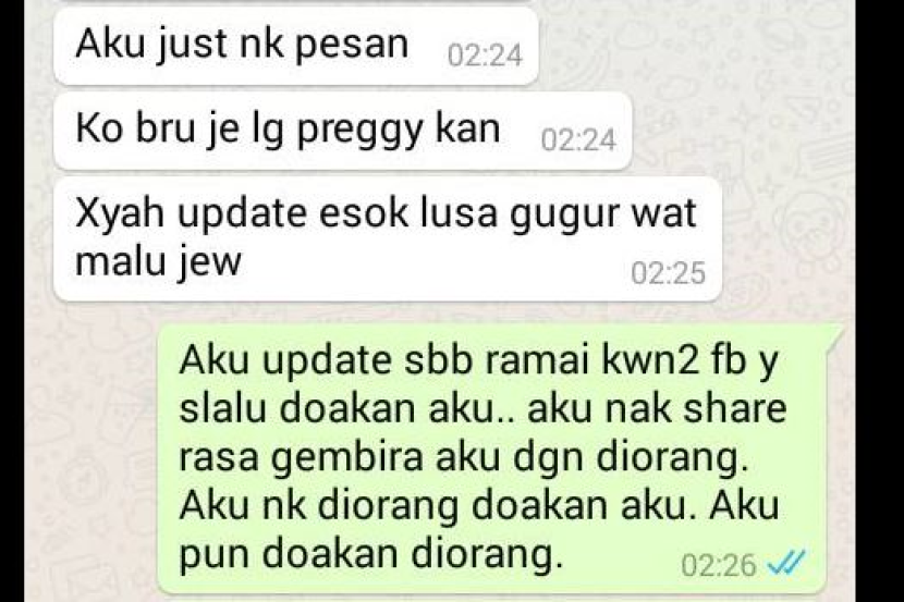 PETALING JAYA: Kegembiraan seorang bakal ibu untuk menimang cahaya mata sulung selepas menanti lebih tiga tahun bertukar menjadi mimpi ngeri selepas menerima pesanan whatsapp daripada seorang kenalan lamanya. Wanita yang bernama Fatimah M. Yasin itu dikejutkan dengan kata-kata penghinaan daripada kawannya, Ima yang menegurnya melalui whatsapp pada pukul 2.20 pagi setelah disekat di laman sosial lain. Perbuatan Ima yang melampau itu seolah-olah tidak menyenangi berita tentang kehamilan Fatimah. Melalui perbualan mereka, Ima 'berpesan' kepada Fatimah agar tidak lagi mengemaskini apa-apa tips kehamilan di facebook kerana dia geli membacanya. "Kau baru je lagi mengandung kan? Tak payah update (muat naik), esok lusa gugur buat malu sahaja. "Ada hati bagi tips hamil, lain la anak dah 10. Ini baru anak sulung selepas tiga tahun pulak. Nampak sangat rahim kau bermasalah," menurut pesanan whatsapp yang dihantar Ima kepada Fatimah. Perbualan penuh mereka dimuat naik oleh Fatimah pada Sabtu lalu menerima pelbagai reaksi netizen yang menyifatkan rakannya itu berhati busuk kerana tidak senang melihat kebahagiaan orang lain. Fatimah yang berang dengan perbuatan tidak berhati perut itu tidak membiarkan dirinya terus ditindas sebaliknya membalas secara sinis dengan mengucapkan 'Selamat Hari Raya' kepada wanita itu. "Kecewanya aku dengan kawan macam kau. Sebab ini la aku block (sekat) kau di instagram, facebook, dan wechat. "Kau negatif, kau tak pernah doakan aku. Aku mintak izin nak block kau. Ucap siap-siap Selamat Hari Raya," balasnya. Setakat ini, posting berkenaan sudah dikongsikan sebanyak 10,724 kali dan menerima 14,000 likes dan 4,900 komen. Pemilik facebook, Liana Idris berkata, perbuatan tersebut menunjukkan rakan Fatimah itu terlalu dengki dengan khabar baik itu. "Silap doa tu berbalik dekat dia. Allahuakbar. Bertabahlah sis (kakak). Tak rugi pun kalau kita tak ada kawan," tulisnya di ruang komen.