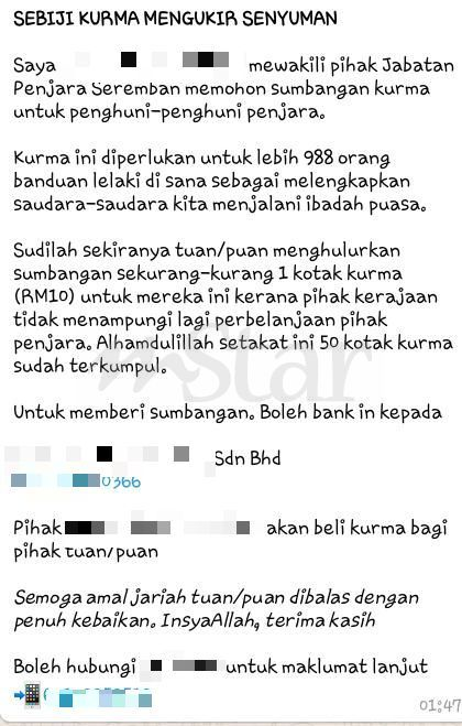 Mesej daripada seorang individu yang mendakwa mewakili Penjara Seremban itu menyebut sumbangan kurma diperlukan untuk lebih 988 banduan lelaki di penjara tersebut.