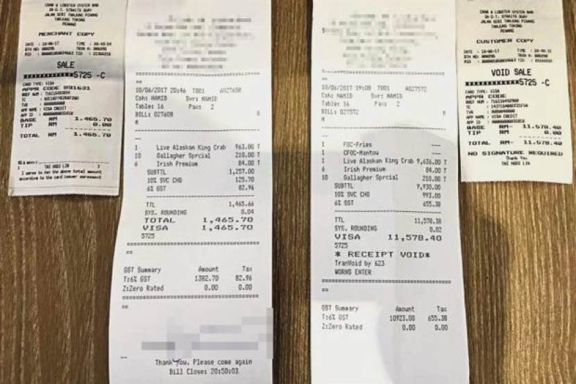 Restoran berkenaan, Crab & Lobster di Straits Quay, mengirimkan beberapa gambar resit yang tersilap dan resit yang betul kepada The Star pada Isnin bagi menjelaskan mengenai perkara yang berbangkit.