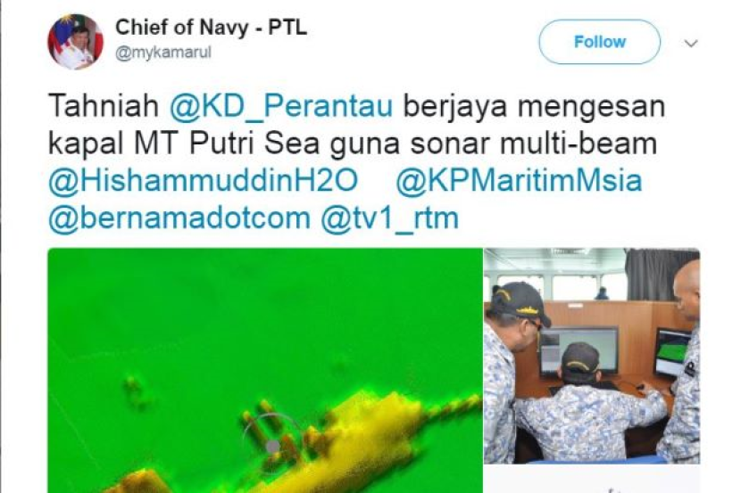 Melalui laman Twitter miliknya, Ahmad Kamarulzaman yang memuat naik status pada petang Ahad turut mengucapkan tahniah kepada kapal KD Perantau kerana berjaya mengesan MT Putri Sea menggunakan sonar 'multi-beam'.