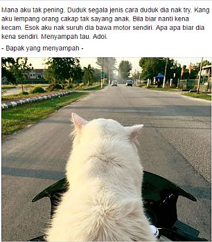 PETALING JAYA: Kucing kesayangan ramai, Fluffy, meneruskan 'keasyikannya' menikmati hembusan angin di muka ketika membonceng motosikal bersama tuannya, kali ini ketika pulang beraya di kampung.