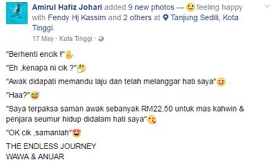 Demikian yang berlaku kepada Khairul Anuar yang telah 'melanggar' hati Wahidah Yazid sehingga beliau terpaksa membayar saman RM22.50 (mas kahwin) dan penjara seumur hidup di dalam hati wanita berkenaan.