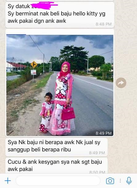 “Saya nak baju ini, berapa awak nak jual? Saya sanggup beli berapa ribu pun. Cucu dan anak kesayangan saya nak sangat baju yang awak pakai,” kata Datuk Z menerusi aplikasi WhatsApp sambil menyertakan gambar dua beranak itu memakai baju kurung moden Hello Kitty.