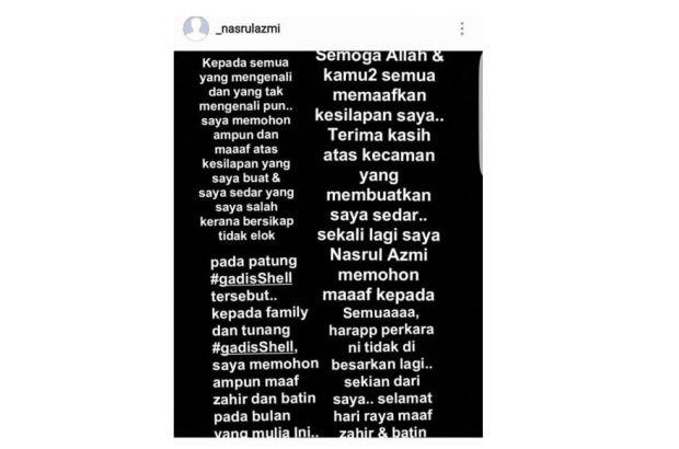 “Kepada keluarga #gadisShell, saya memohon ampun maaf zahir dan batin pada bulan yang mulia ini,” katanya menerusi paparan skrin akaun Instagram ‘_nasrulazmi’ yang dikongsikan di Facebook Mualim Mohd Fadhli pada Ahad.