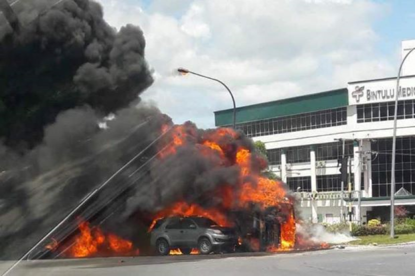 BINTULU: Sebuah lori tangki minyak meletup di hadapan Pusat Perubatan Bintulu di Jalan Kidurong di sini.