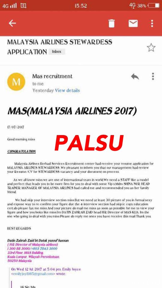 "Tiada perekrutan untuk jawatan kru penerbangan buat masa ini. Kami ingin menasihatkan agar orang awam mengabaikan emel seperti ini.