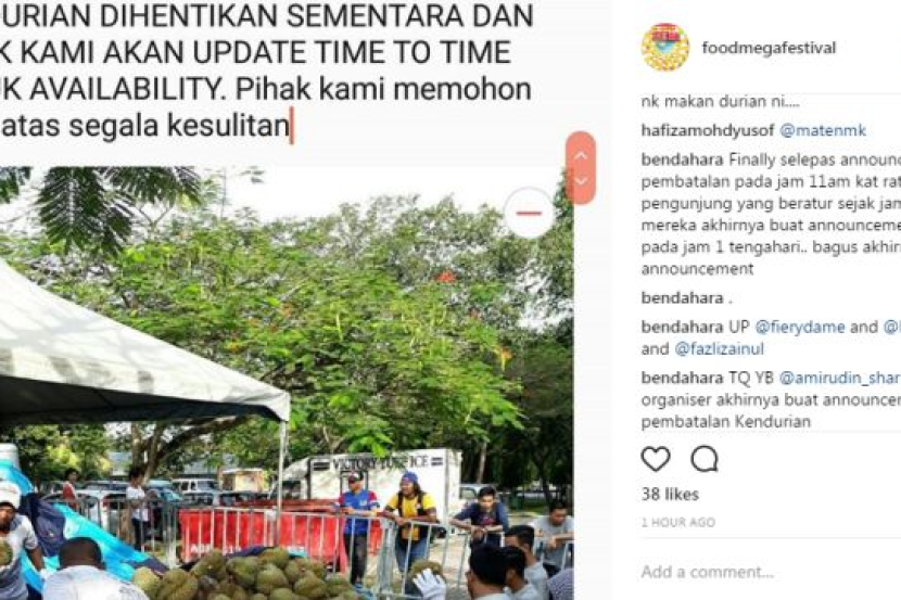 "Sebagai penganjur kita dah jalankan tanggungjawab, kita dah buat pengumuman acara dihentikan sementara, dan dalam masa sama kita berusaha minta bekalan durian dari Perak dibawa secepat mungkin," katanya.