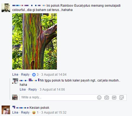 Seorang pengguna lain pula memberitahu bahawa pokok berwarna-warni memang wujud dan ia dipanggil Pokok Pelangi (Eucalyptus deglupta). Pokok ini boleh dijumpai tumbuh meliar di New Britain, New Guinea, Ceram, Sulawesi dan Mindanao.