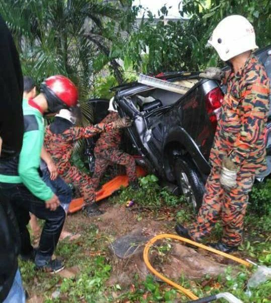 Pasukan bomba mengeluarkan kedua-kedua mangsa dari kenderaan yang dinaiki.