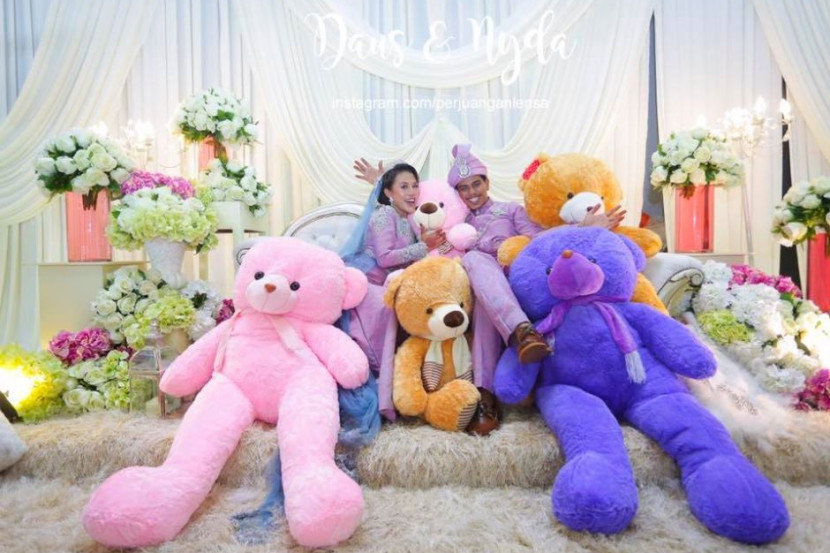 Bukan satu, bukan dua, tapi lapan patung beruang bersaiz besar disusun di atas pelamin, bagaimanapun kata Firdaus, ada beberapa patung terpaksa diturunkan semasa sesi fotografi memandangkan ruang pelamin agak terhad.