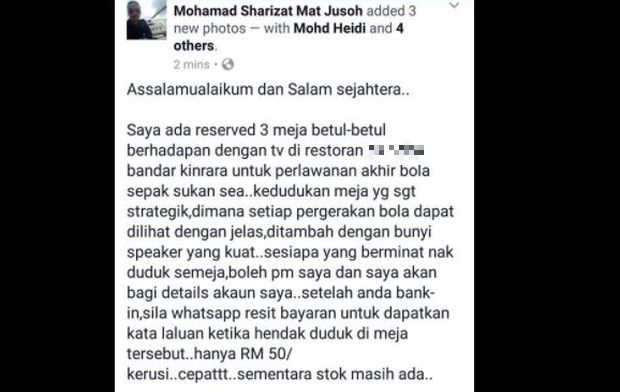 “Kedudukan meja yang sangat strategik, di mana setiap pergerakan bola dapat dilihat dengan jelas, ditambah dengan bunyi ‘speaker’ (pembesar suara) yang kuat. Sesiapa yang berminat nak duduk semeja, boleh PM (mesej peribadi) saya dan saya akan bagi butiran akaun. Setelah anda ‘bank-in’, sila whatsapp resit bayaran untuk dapatkan kata laluan ketika hendak duduk di meja tersebut. Hanya RM50 satu kerusi. Cepat, sementara stok masih ada,” katanya.