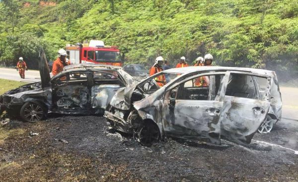 Dua kereta musnah terbakar dalam satu kemalangan dekat Pengkalan Hulu, Perak, Rabu lalu.