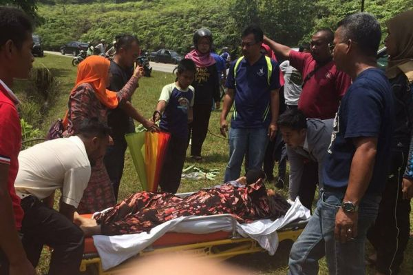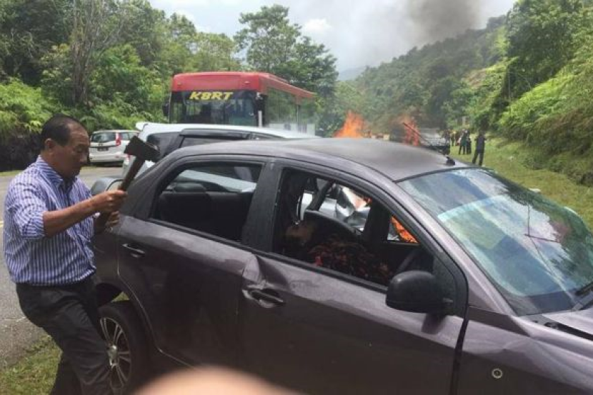 Salah seorang mangsa yang terperangkap di dalam kereta berjaya dikeluarkan dengan bantuan Thoo Seen dan beberapa orang awam.