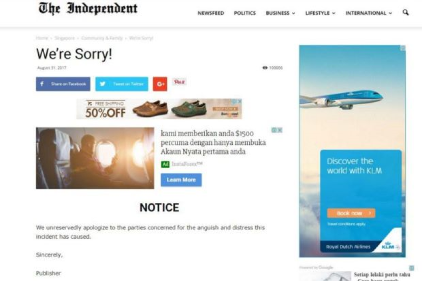 Semakan terhadap artikel di laman web itu digantikan dengan notis yang bertajuk "Kami Mohon Maaf!".