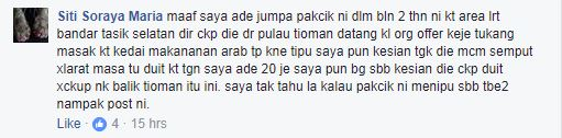 "Selepas hulur wang kepadanya, dia menunggu bas di depan sebuah sekolah untuk pulang ke Pulau Tioman selepas mendapati pekerjaan yang ditawarkan di Bahau itu tidak wujud," jelasnya lelaki yang bekerja sebagai kru teknikal syarikat pengurusan majlis di ibu negara itu.