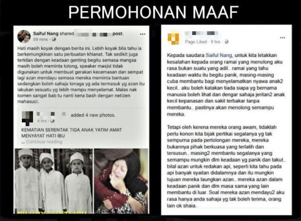 “Saya dengan rendah hati ingin memohon maaf atas kenyataan saya yang mempertikaikan laungan azan yang mendayu dilaungkan semasa tragedi kebakaran di pondok tahfiz di Keramat baru-baru ini.