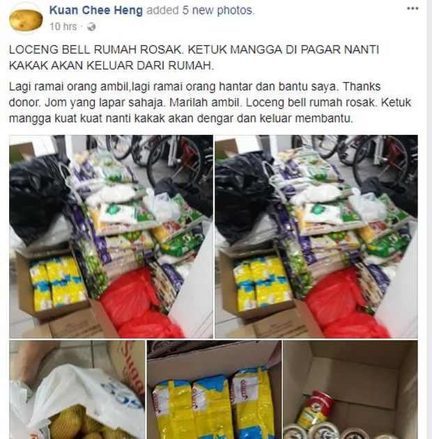 Chee Heng berkata, banyak sumbangan yang dihantar ke kediamannya terutama bahan makanan seperti beras, tin sardin, minyak masak dan tepung.