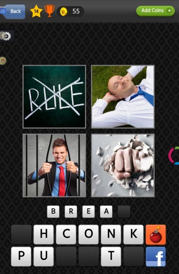 Aku melihat skrin telefon bimbit tersebut. Tertera permainan PIQ, teka gambar. Diberi empat keping gambar, dan beberapa kotak kosong bersama beberapa abjad.