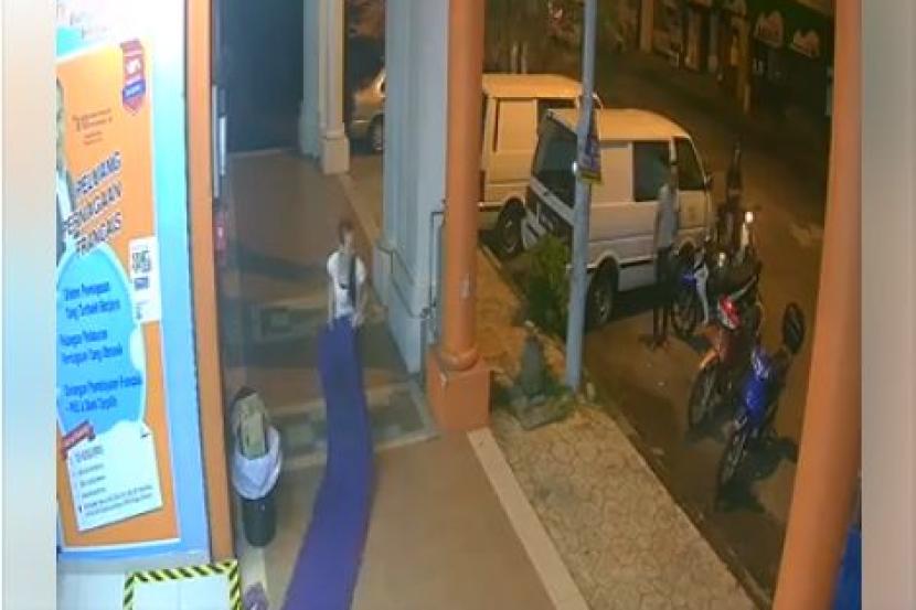 Pada awalnya, seorang remaja lelaki berpura-pura masuk ke dalam premis tersebut dan mengesat kakinya pada alas kaki yang diletakkan di hadapan premis berkenaan.