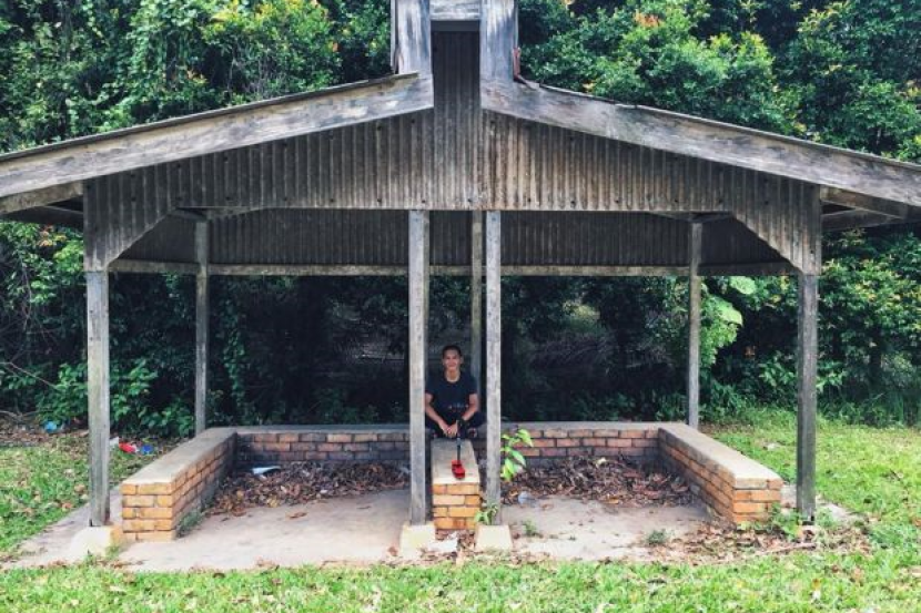 Walaupun masih berdiri kukuh, tetapi keadaannya terbiar dengan daun-daun kering berselerakan di lantai yang dikelilingi bangku batu.