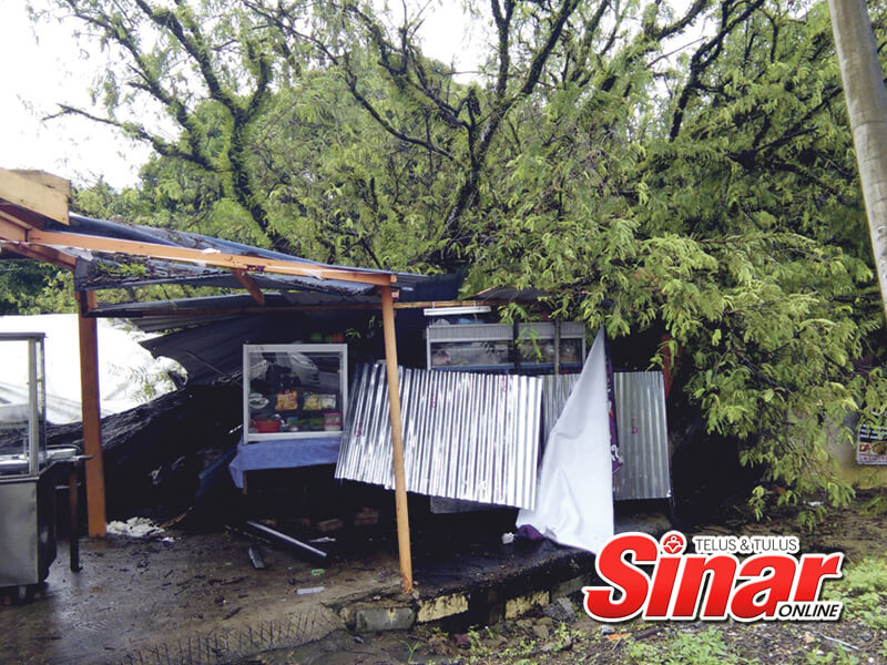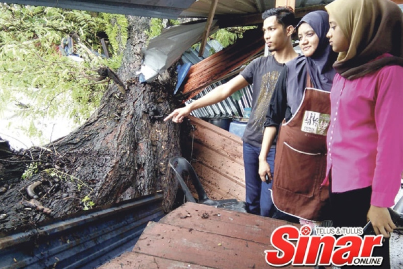 Antara kerosakan yang dialami kedai makan Cek Bah, di sini selepas ditimpa pokok yang tumbang dalam kejadian jam 11 pagi Ahad.