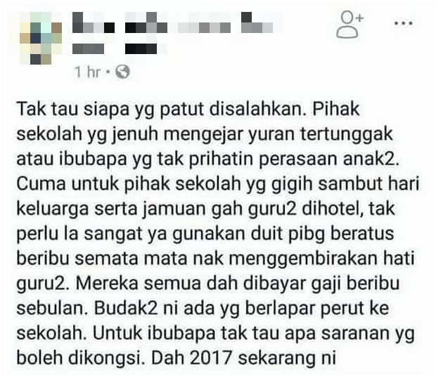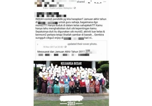 “Sepatutnya duit itu digunakan untuk murid-murid, aktiviti luar kelas dan bermacam-macam perkara,” katanya sambil memuat naik gambar sekumpulan guru di sebuah hotel terkemuka di Selangor.