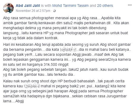 "Asalnya saya pun sudah biasa bila ada tetamu minta tolong tangkap gambar guna telefon bimbit mereka, tak dinafikan ada juga yang kurang beradab sehingga membuatkan para jurugambar berasa hati.