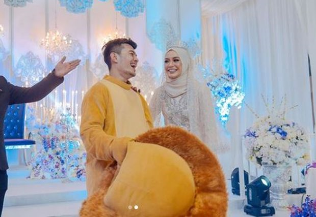 “Jadi pada majlis perkahwinan ini, saya memakai pula maskot singa untuk memberi kenangan kepada detik-detik percintaan kami,” katanya.