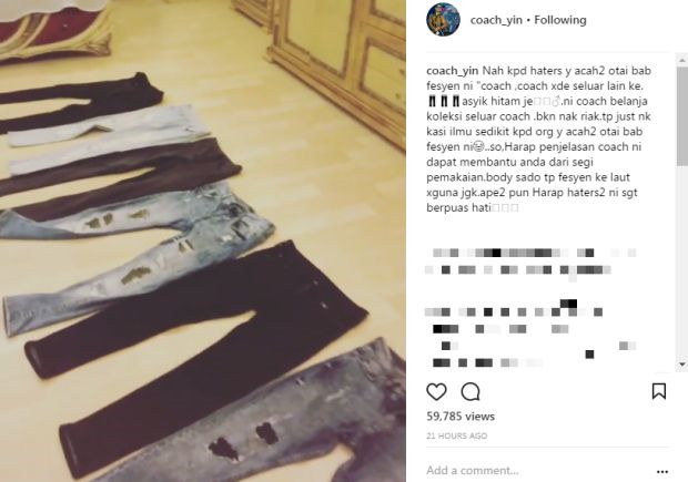 “Tadi Coach ada dapat banyak komen daripada ‘haters’ semua, ada yang komen ‘Coach tak ada seluar lain ke, asyik seluar hitam je?