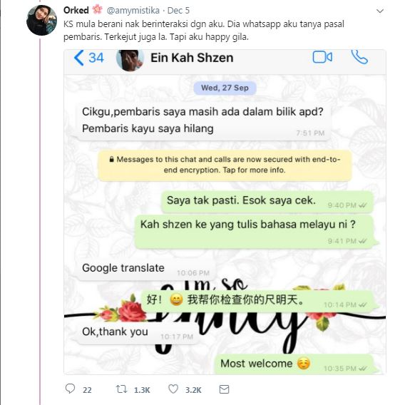 Bagaimanapun, dia akhirnya menarik nafas lega apabila pelajar itu langsung tidak memarahinya dan tidak mempunyai masalah dengan posting tersebut.