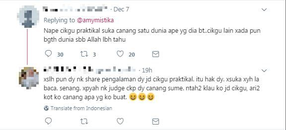 Amy Mistika yang merupakan pelajar tahun akhir di Universiti Pendidikan Sultan Idris (UPSI) memberitahu, guru pembimbing di sekolah tersebut ada menegur dirinya secara baik sejurus mengetahui tentang perkara itu dan berpesan agar dia belajar daripada kesilapan.