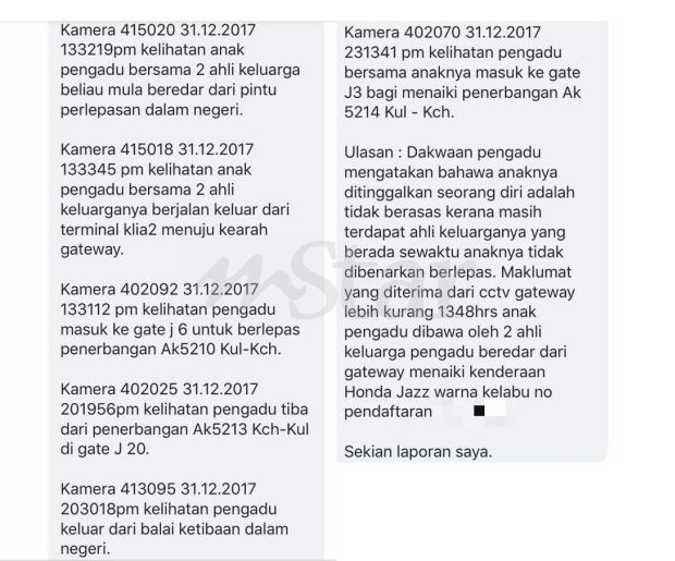 Bagaimanapun laporan pegawai bertugas kepada pengurusan MAHB yang kini tersebar di media sosial dan aplikasi WhatsApp mendakwa anak pengadu bersama dua ahli keluarganya telah meninggalkan KLIA2.