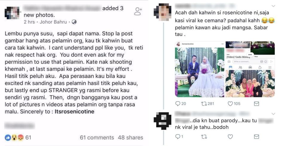 Posting yang dimuat naik oleh seorang wanita yang mendakwa pelamin perkahwinannya digunakan oleh Itsrosenicotine tanpa kebenaran.